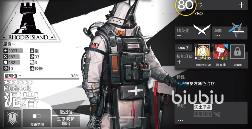 干員泥巖是六星重裝角色,其職業(yè)分支為鐵衛(wèi),即具有極強(qiáng)防御能力的干員,可以說如果算上天賦特性的話,泥巖是整個游戲中最能抗傷害也是最能打輸出的重裝干員,即便是星熊也無法與她媲美。泥巖的天賦特性可以讓她周期性地獲得一層護(hù)盾,護(hù)盾可以積攢三層,每層都可以幫助泥巖抵擋一次傷害。換句話說不管敵人輸出多變態(tài),泥巖也絕對可以抗住至少三次,像在危機(jī)合約這種高難度本中泥巖護(hù)盾的發(fā)揮空間就很大,登場率極高。