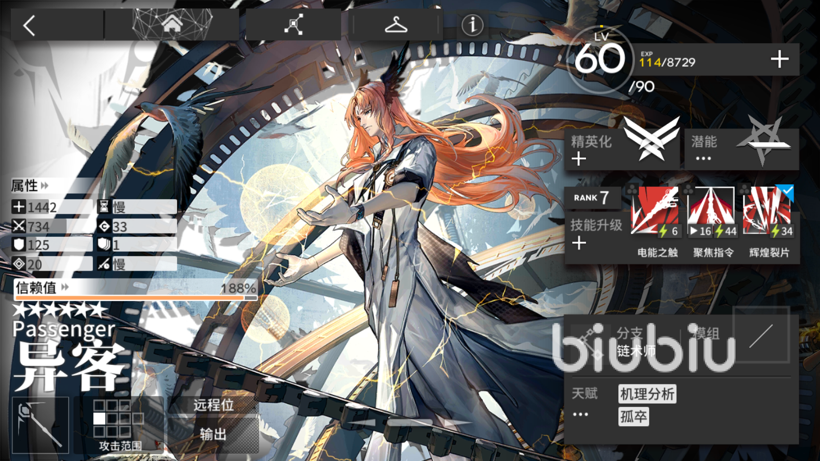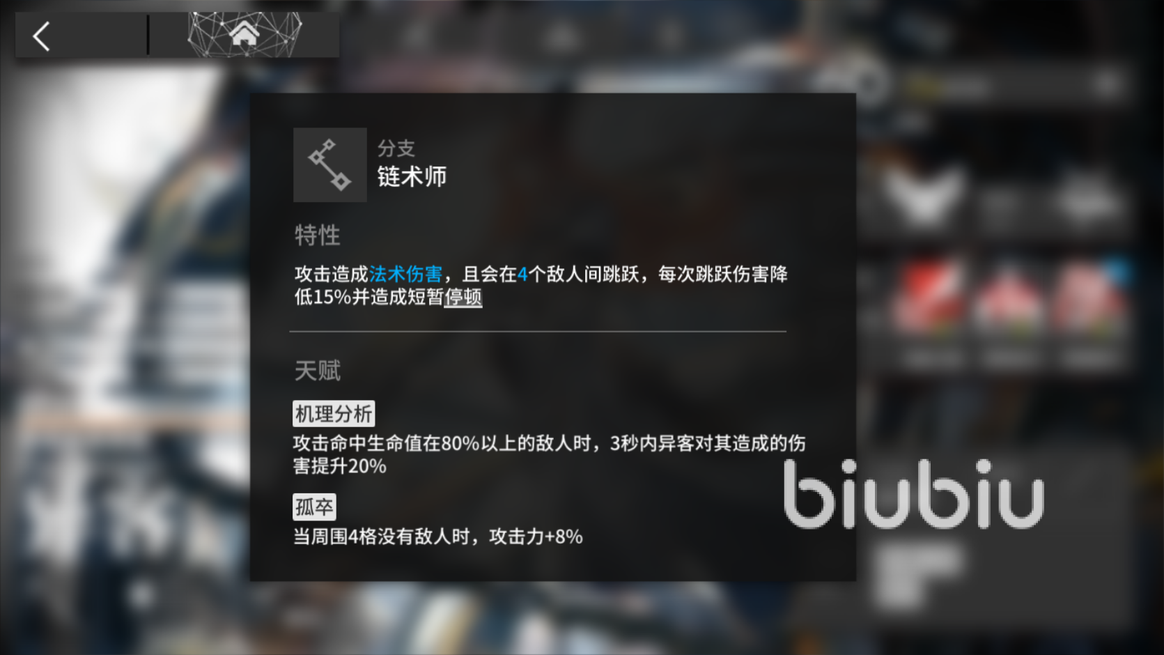 明日方舟中干員異客是很少見的鏈法,目前游戲中只有驚蟄和異客屬于該模組的干員。鏈法最大的特點(diǎn)就是費(fèi)用高,異客的費(fèi)用就有33點(diǎn),而同樣是六星術(shù)士的伊芙利特也是這個(gè)費(fèi)用。鏈法長期以來飽受詬病的就是其不匹配費(fèi)用花費(fèi)的輸出和控制能力,和艾雅法拉,刻俄柏這樣的傳統(tǒng)六星單體術(shù)士相比,異客的輸出能力不足,而和同樣費(fèi)用的群攻術(shù)士相比,異客的群攻能力又偏差。