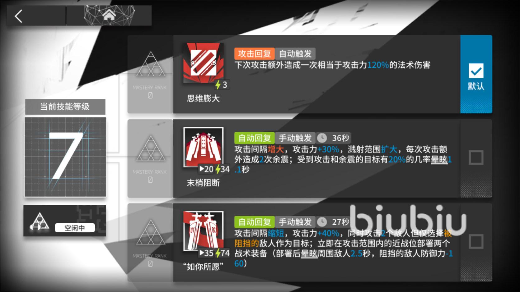 不過,迷迭香的三技能“如你所愿”在一定程度上彌補(bǔ)了她的缺陷:如你所愿可以在地面召喚兩個(gè)高血量的阻擋物,技能持續(xù)期間迷迭香會(huì)提升攻擊頻率以及攻擊力,但是只會(huì)攻擊被阻擋的敵人。這個(gè)技能在開啟后迷迭香的輸出能力比專三過載的能天使還要高,且面對高甲敵人時(shí)的輸出要更有效,不過如你所愿只能攻擊被阻擋敵人的這一特性的限制較大,不搭配其它干員很難用好這個(gè)技能。