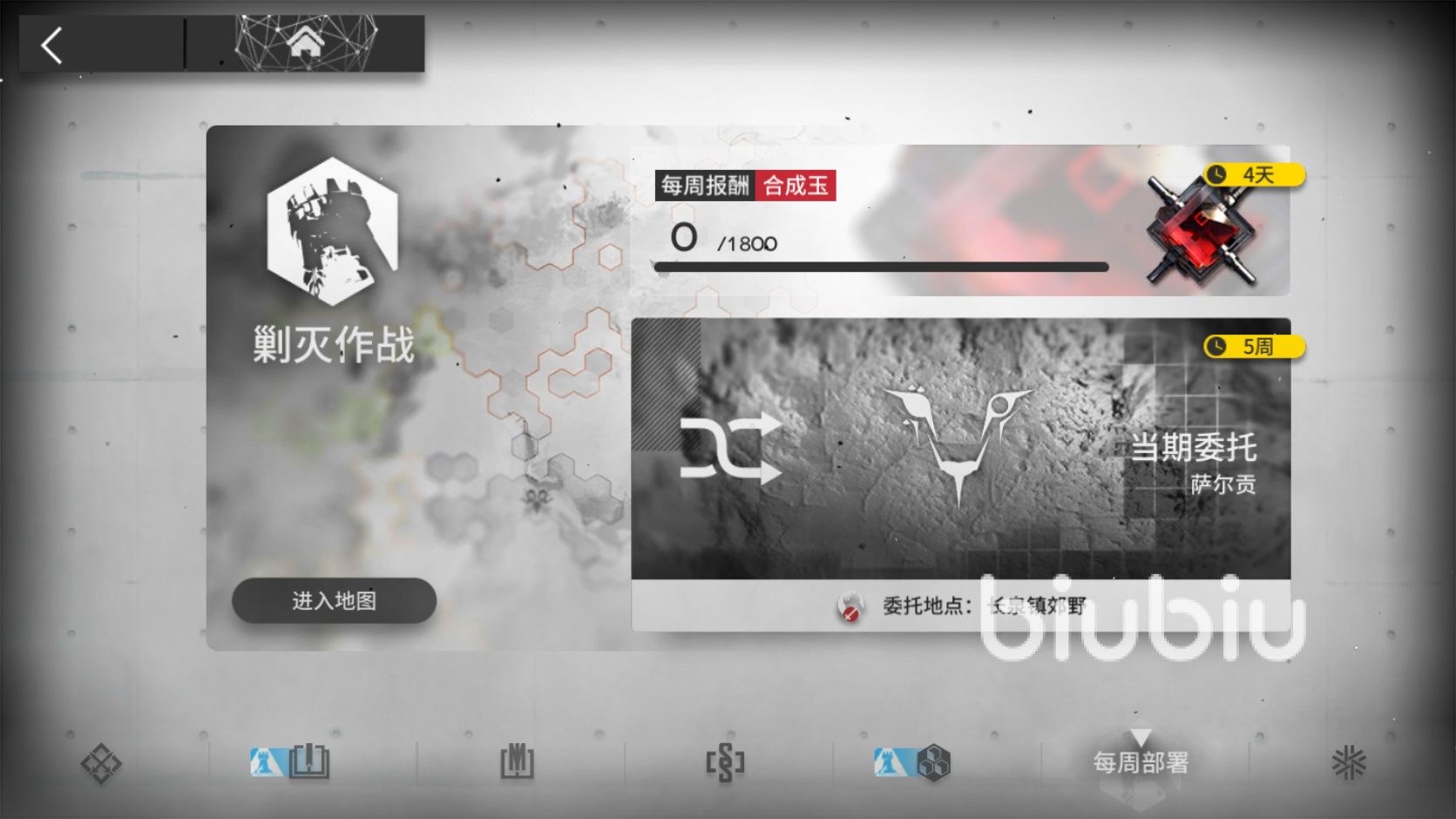 而剿滅作戰(zhàn)模式的位置實(shí)際上也非常好找,在游戲的主界面點(diǎn)擊關(guān)卡選擇,在右下角倒數(shù)第二個(gè)的“每周部署”界面我們就可以進(jìn)入到剿滅作戰(zhàn)了。不過(guò),剿滅作戰(zhàn)模式又分為當(dāng)期委托,常駐委托和限時(shí)委托(模擬戰(zhàn)),這三個(gè)還是要區(qū)分好的,否則會(huì)出現(xiàn)打完剿滅沒(méi)有獎(jiǎng)勵(lì)的情況。