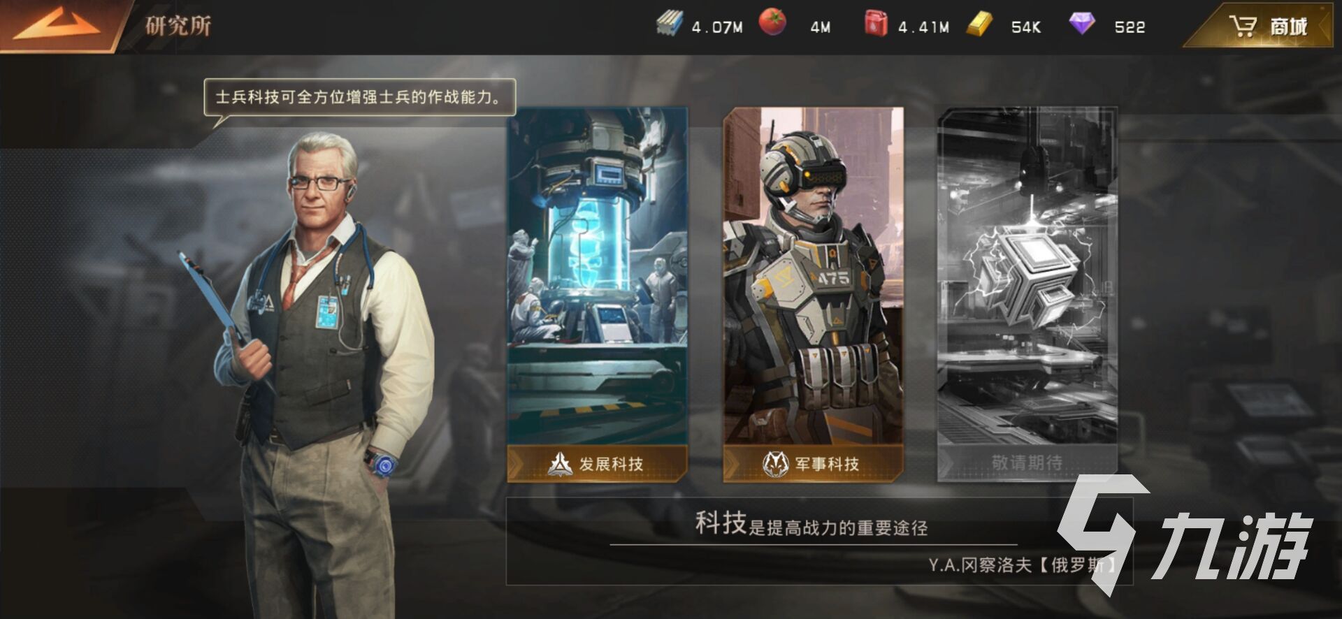 我們可以首先來(lái)到研究所,這里一共有兩個(gè)選項(xiàng),分別是發(fā)展科技和軍事科技,這時(shí)候我們就要選擇軍事科技了,因?yàn)榘l(fā)展科技是針對(duì)于我們基地的建設(shè)的,軍事科技能夠提升我們的戰(zhàn)斗能力。
