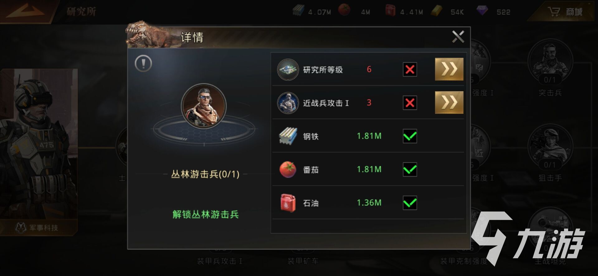 我們?cè)谶M(jìn)入到軍事科技的頁(yè)面之后,就能夠在第三列的位置發(fā)現(xiàn)一個(gè)叢林游擊兵解鎖的選項(xiàng),而這個(gè)解鎖是需要一定條件的,小伙伴們需要將研究所升級(jí)到六級(jí)的時(shí)候,才能夠解鎖這個(gè)選項(xiàng),除此之外,小伙伴們還需要將前兩列的科研全部解鎖,之后我們就可以通過(guò)一些資源來(lái)解鎖叢林游擊兵了,研究完成,我們便能夠在近戰(zhàn)兵營(yíng)中訓(xùn)練他了。