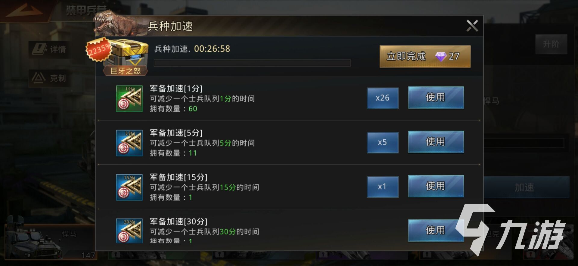 除此之外,我們在點擊了招募按鈕之后,會出現(xiàn)各種各樣的加速選項,這里小編是建議小伙伴可以使用軍備加速的方式進行加速的,這樣的道具還是非常容易通過活動獲得的,小伙伴可以使用,注意時間就好了,不要用相差過大的軍備加速,這樣可以實現(xiàn)道具的最大化使用。