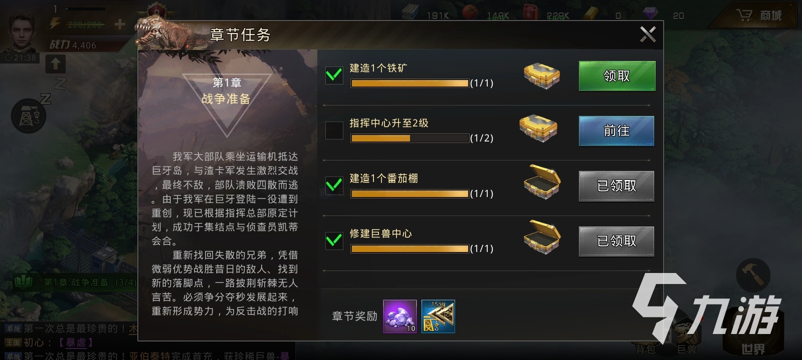 首先玩家需要知道接受戰(zhàn)場的第1章叫做戰(zhàn)斗準(zhǔn)備,可以說第1個(gè)章節(jié)是為后期打下堅(jiān)實(shí)基礎(chǔ)的一個(gè)章節(jié),玩家需要做的就是不斷的根據(jù)頁面上的提示,做完第1局的任務(wù),第1局的主要任務(wù)就是收復(fù)一只巨獸,然后再簡單的建設(shè)一下基地。