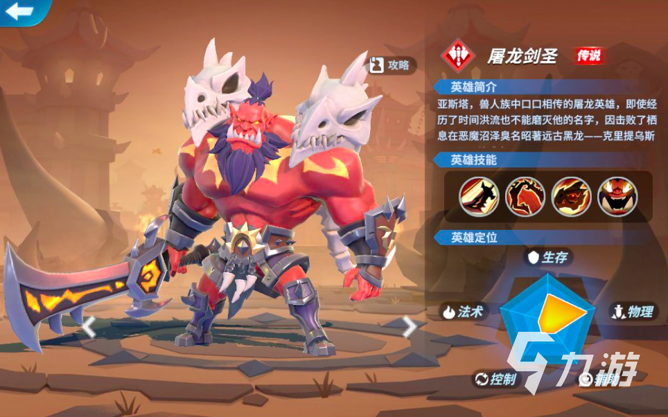 2. 屠龍劍圣:前排輸出,大招是全體傷害和自身加盾,確保了站在前排的生存能力。同時(shí)輸出能力也很強(qiáng),20%的無(wú)視護(hù)甲,擊殺敵人還有25%的攻擊加成(最高能疊四層),配合他的暴擊神技,對(duì)低于40%血的敵人必暴,斬殺收割能力一流,是獸人陣容必備核心。