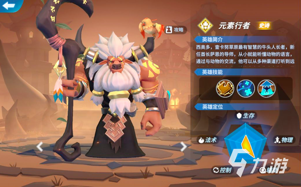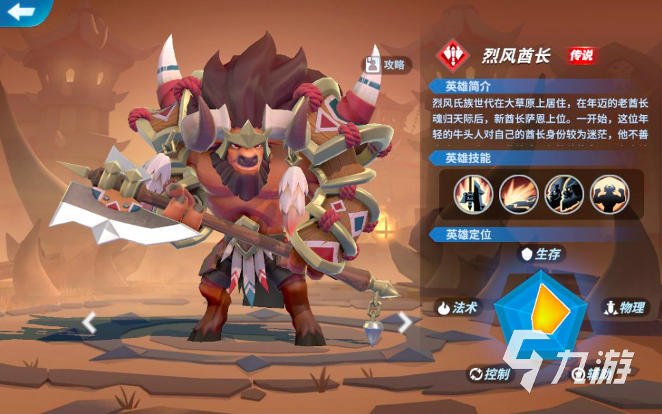 3. 烈風(fēng)酋長(zhǎng):坦克加輸出,被動(dòng)是所有獸人隊(duì)友攻擊增傷;還有減防技能,血量越少效果越好。大招是直線輸出,傷害可觀。培養(yǎng)優(yōu)先級(jí)建議排在屠龍劍圣后面就好。