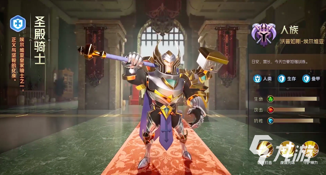 1. 圣殿騎士:坦克,范圍團控+前排增益,這是一個能扛能打的坦克,眩暈是范圍控制,技能有可觀的傷害同時可以自身回血,增益是針對前排英雄有一個護甲加成和減傷,續(xù)航能力優(yōu)秀。