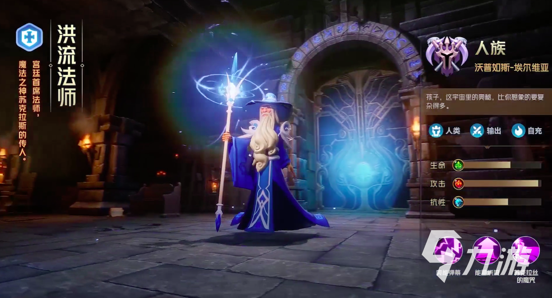 4. 洪流法師:后排法術(shù)輸出,大招配合增傷(幅度是按照人類英雄的數(shù)量*40%),傷害越疊越高,搭配獅心盾衛(wèi)能快速aoe清場,是這個陣容的輸出C位。被動還能回藍和沉默,給前排喘息的機會。