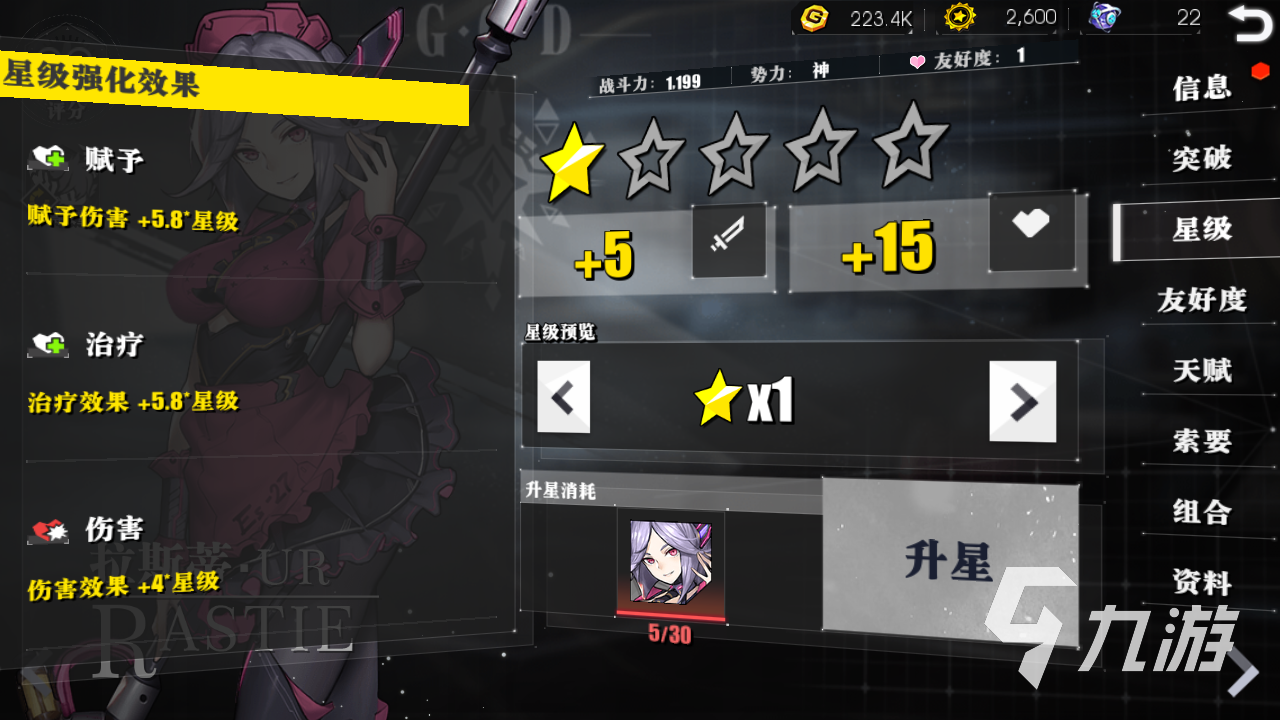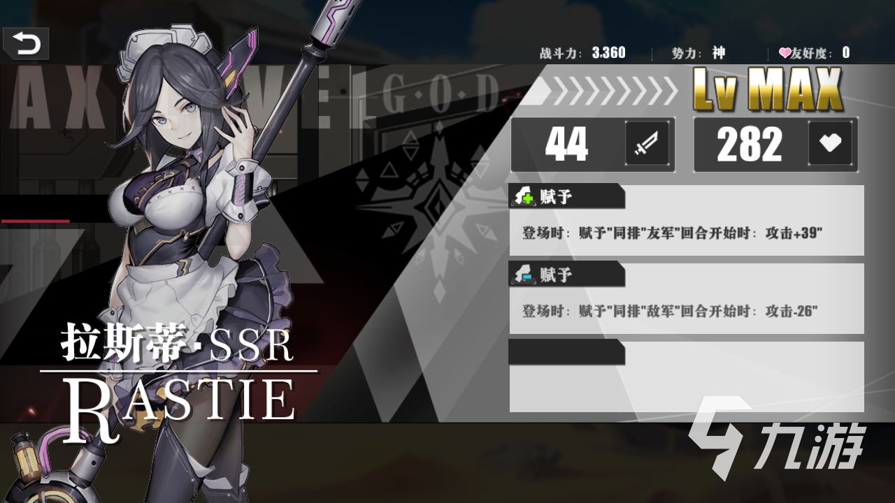 先來看一看SSR的拉斯蒂,這個品級的滿級屬性是44點攻擊力,血量是282點,在近戰(zhàn)的這個品級里面算是比較強的,雖然說不是頂點,但也還不錯。技能上,特殊的夫賦予技能可以給同排的友軍提供39點的攻擊力提升。這個技能在每個回合開始的時候都會發(fā)動,那么在搭配的時候就要注意伙伴的位置分配了,盡量將這個加成給吃到。