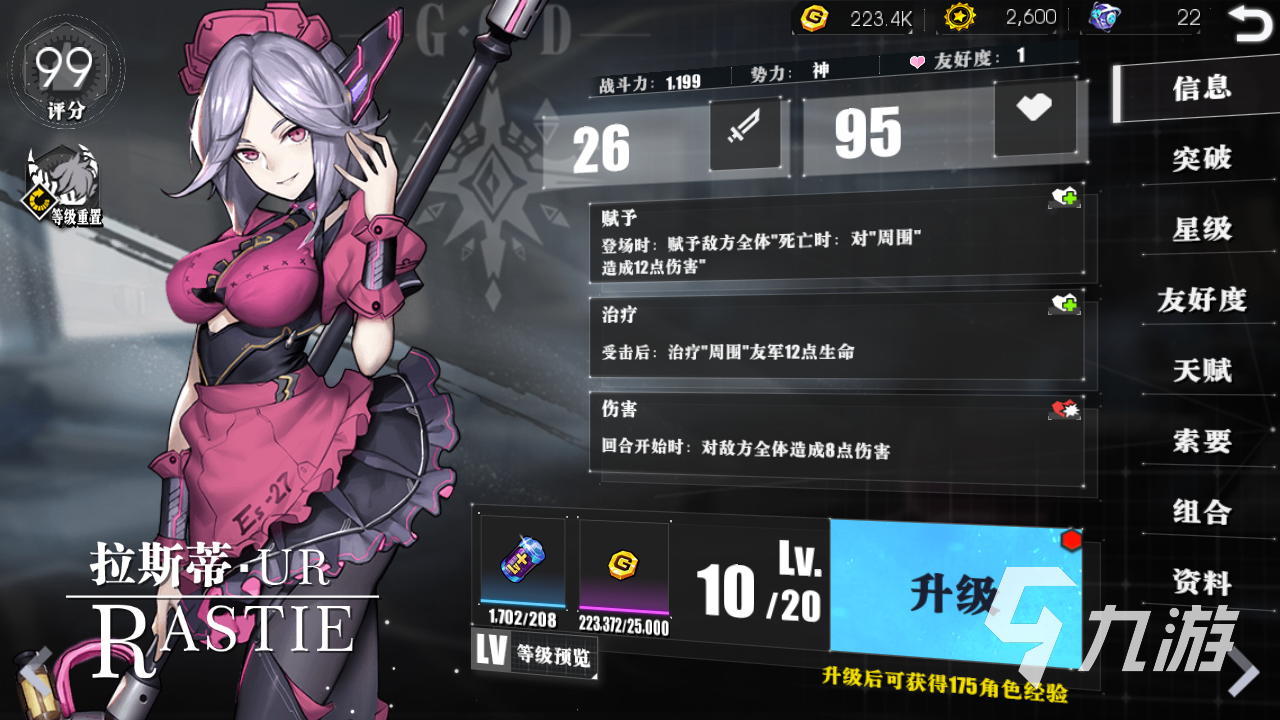 再來看一看UR的拉斯蒂,滿級屬性是108攻擊和294血量,攻擊力是比較不錯的,但是血量提升不是很大。賦予技能在登場之后可以賦予敵人死亡效果,在敵人陣亡之后會對周圍單位造成72點傷害。治療能力在受到攻擊之后會治療周圍友軍72點生命值。傷害能力在每個回合開始的時候會攻擊全體造成49點的傷害。