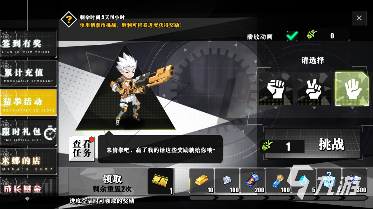 猜拳活動(dòng)這個(gè)玩法的開啟要求不是很高的,只要主角等級(jí)達(dá)到了五級(jí)就可以解鎖了。在解鎖之后,該玩法是要從左下角的玩法圖標(biāo)中進(jìn)入,不管是點(diǎn)擊新手目標(biāo)還是基金都是可以看到的,左邊可以點(diǎn)擊來記進(jìn)行切換。