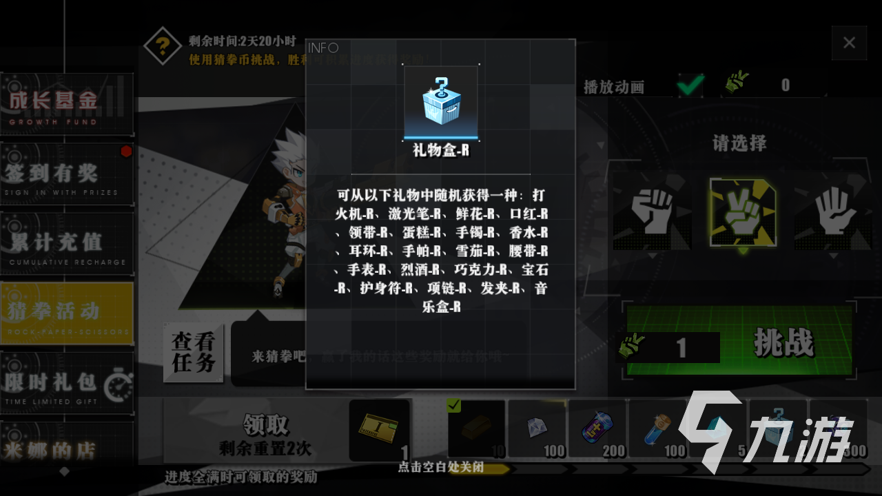 猜拳的結(jié)果肯定是看玩家和對(duì)手出的什么,這個(gè)獲勝規(guī)則相信大家都是比較了解的。在獲勝利之后可以累積獎(jiǎng)勵(lì)的進(jìn)度,這個(gè)只有勝利才會(huì)累積,失敗是不會(huì)提升的。