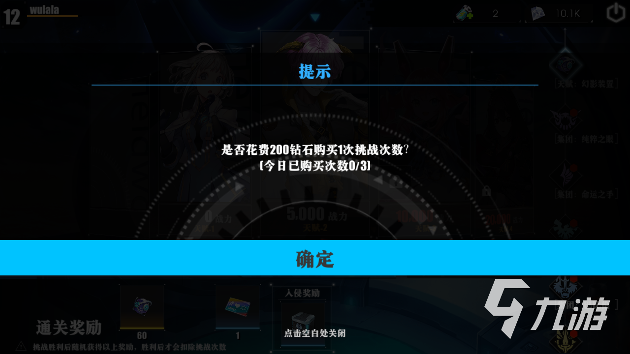 最后就是挑戰(zhàn)次數(shù)了,這個(gè)次數(shù)的話每個(gè)副本之間是不通用的。主角的天賦副本是默認(rèn)有兩次挑戰(zhàn)機(jī)會(huì)的, 其他副本的話就只有一次的機(jī)會(huì)。如果覺得不夠,可以花費(fèi)鉆石來購買,每日可以買三次。