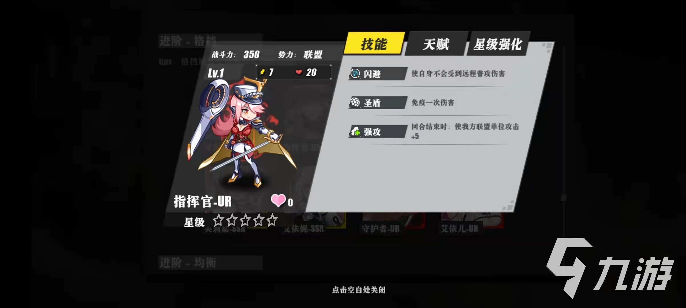 其中守護者-SR的技能是賦予和治療,賦予的效果是在受到攻擊之后,增加一點格擋,治療的效果是在回合開始的時候,自身能夠恢復(fù)兩點血量。兩點血量雖然不多,但是一旦觸發(fā)了格擋,那么就可以減少傷害,這樣就可以有時間去恢復(fù)血量了。指揮官-SR的技能是閃避,圣盾和強攻,閃避的效果是自身不會受到遠程普攻的傷害。這樣一來,指揮官就相當(dāng)于減少了一半的普攻傷害,可以在前排站的時間長一些。