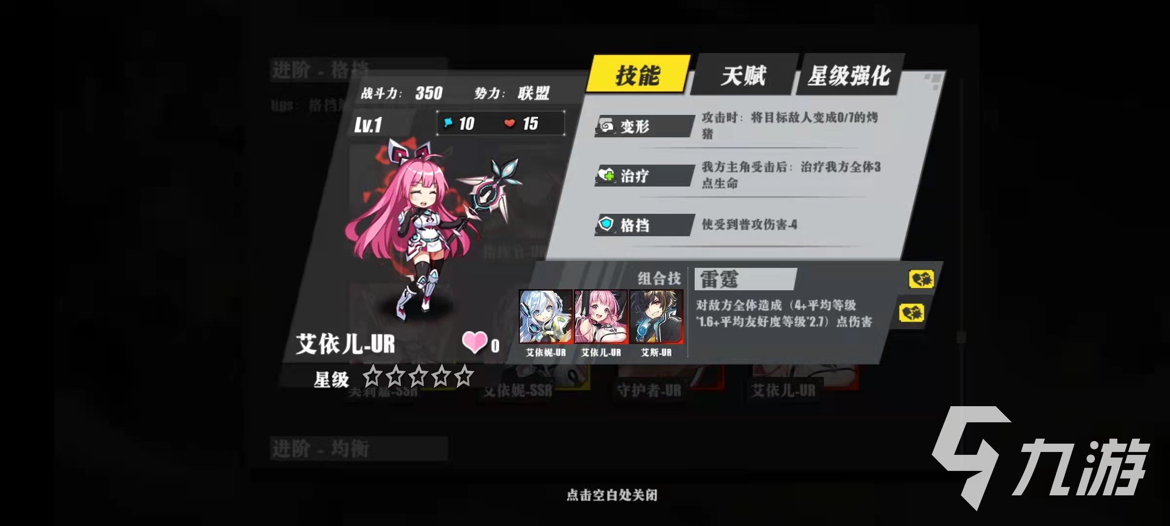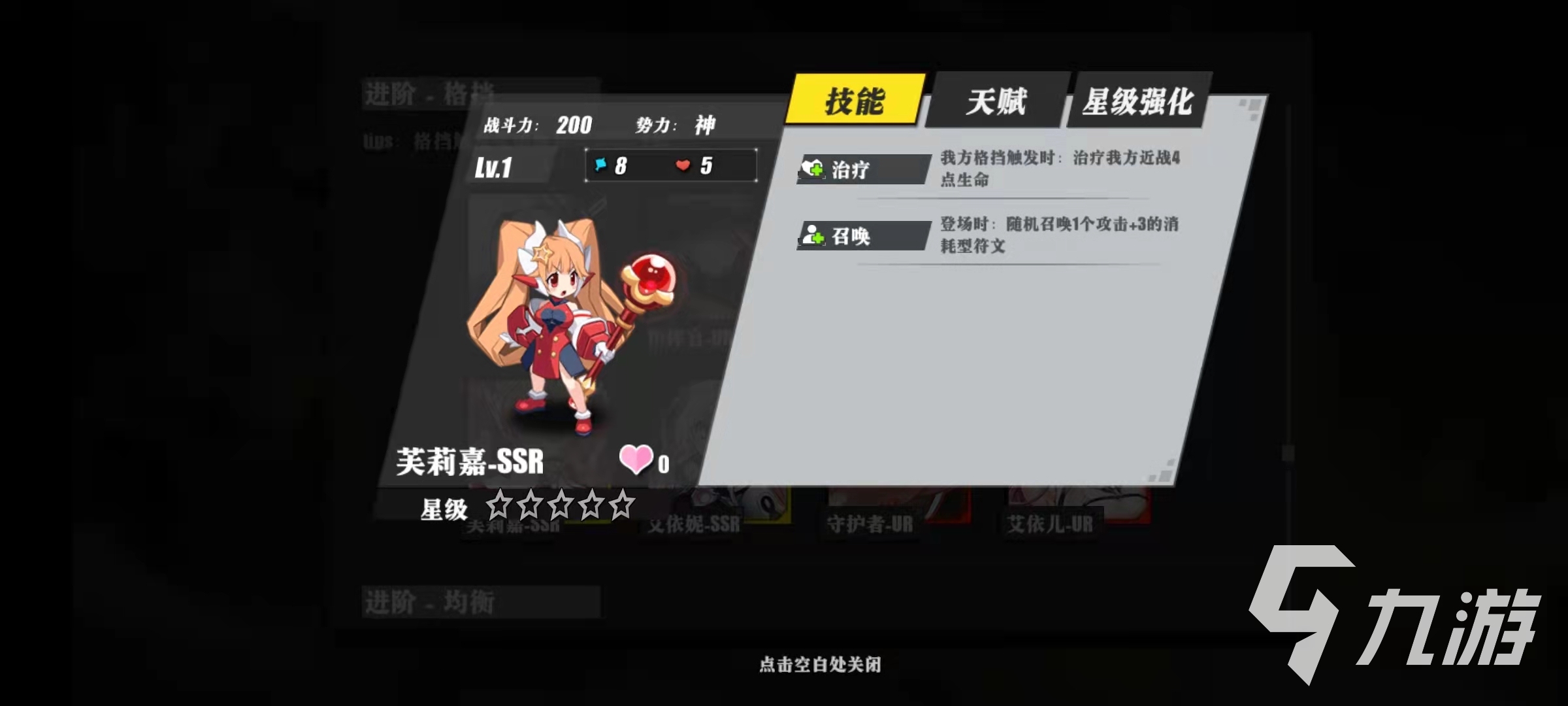 芙莉嘉-SSR的技能是治療和召喚,治療的效果是當(dāng)我方格擋觸發(fā)的時候,就可以治療我方的近戰(zhàn)英雄的四點血量,召喚的效果是在出戰(zhàn)的時候,可以隨機召喚出一個增加攻擊的符文,可以增加三點攻擊力。其他角色觸發(fā)的格擋都會在芙莉嘉-SSR這里轉(zhuǎn)化為治療效果,這對于前排抗傷害的四名角色是非常有利的支撐。艾依妮-SSR的技能是傷害和賦予,傷害的效果是當(dāng)我方觸發(fā)格擋之后,可以隨機對一名敵人造成四點傷害,賦予的效果是在出現(xiàn)的時候,己方全體的友軍增加三點格擋。