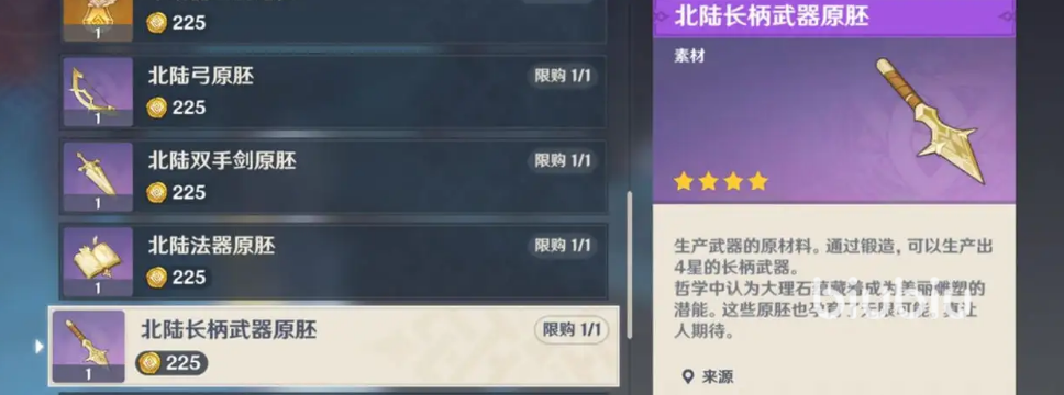 如果想要擁有四星武器的話那么就必須要先獲得北陸長柄原胚,它是鍛造四星武器的原始材料。獲得它以后可以前往鐵匠處,然后把水晶塊、白鐵礦和北陸長柄原胚一起交給鐵匠,就能得到四星武器了。
