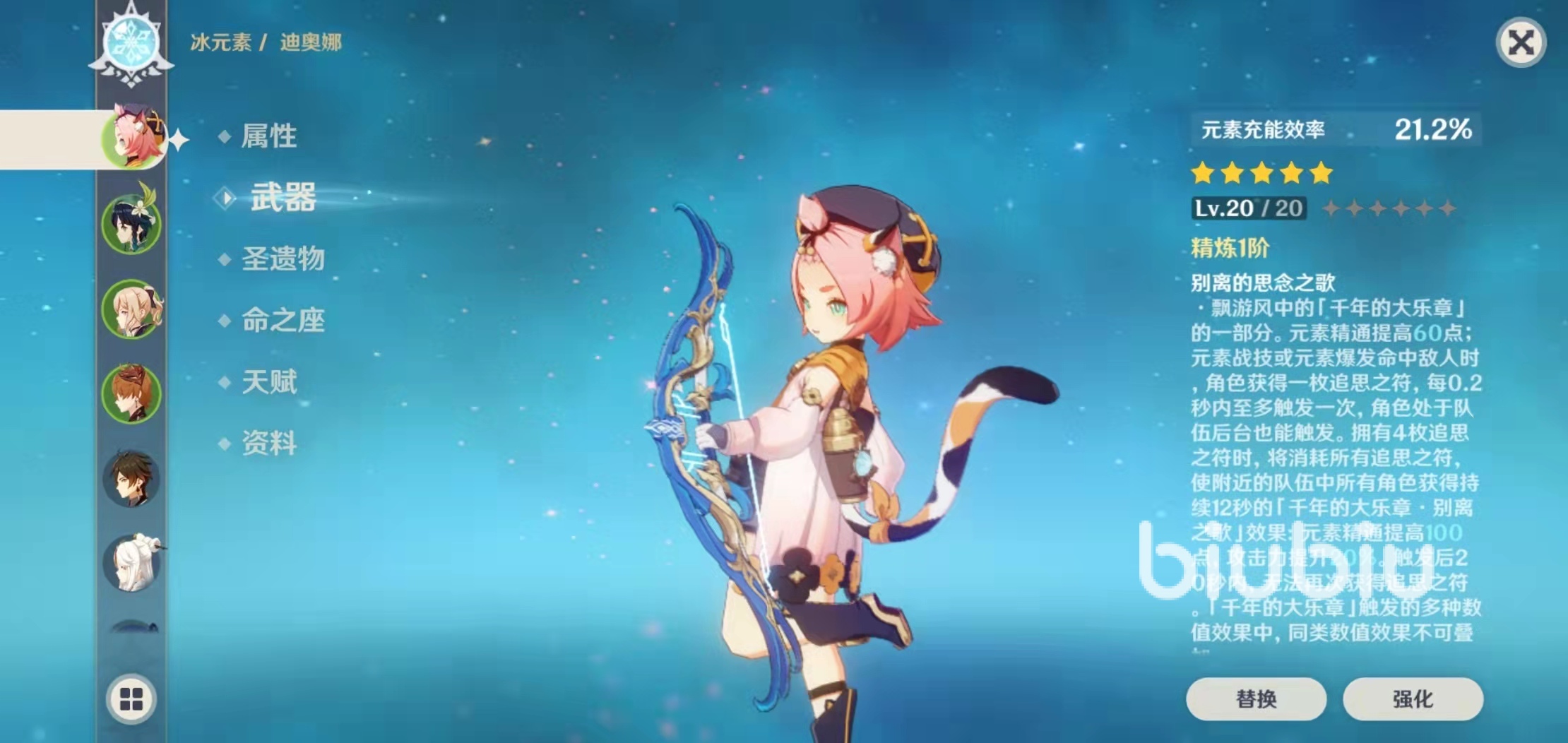 2.迪奧娜,冰元素弓箭角色,也是一位套盾角色,大招是范圍性治療效果,滿命后的大招范圍內(nèi)可以提升角色元素精通/治療加成。E技能長按可以提升護盾量。在深淵中一直有著很大的作用。