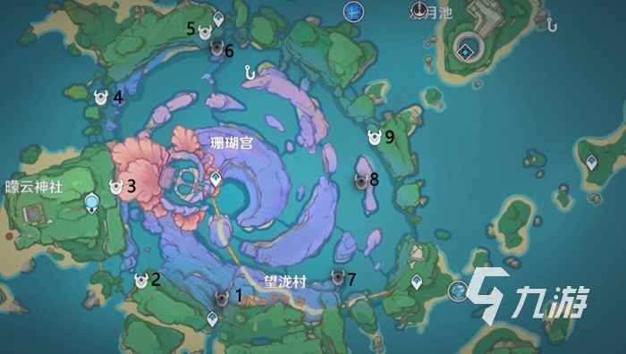 第一個(gè)地點(diǎn)在剛才我們傳送的望瀧村西南方傳送錨點(diǎn)的上方,第二個(gè)在傳送錨點(diǎn)西北方稍遠(yuǎn)的方向,第三處在曚云神社傳送錨點(diǎn)右邊一點(diǎn)而,第四個(gè)在這個(gè)位置的西北方向。第五個(gè)和第六個(gè)離得比較近,都是在珊瑚宮北方的傳送錨點(diǎn)下面,第七個(gè)在望瀧村的東面。第八個(gè)在第七個(gè)位置北放的一座島上。這些寶藏地點(diǎn)已經(jīng)在地圖上標(biāo)注出來(lái)了,大家可以“按圖索驥”進(jìn)行尋找,找到林藏留下的標(biāo)記進(jìn)行挖掘就可以了。