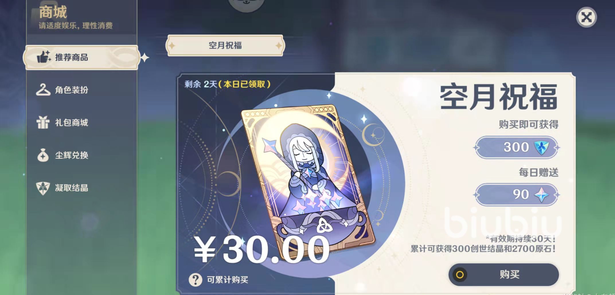 3.小月卡黨,每天登陸即可領(lǐng)取90原石,20天就是1800。
