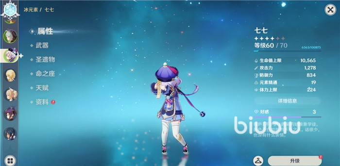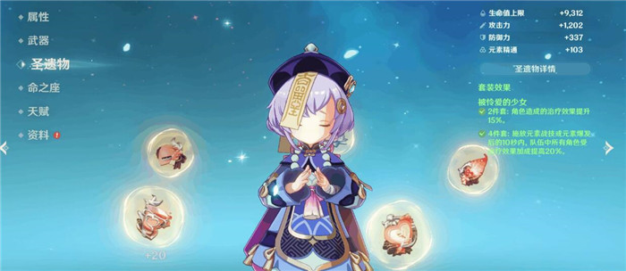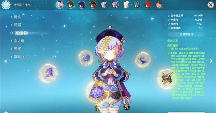 七七是一個擁有很高治療量和一定輸出的輔助角色,圣遺物選擇可以在攻擊力百分比、元素充能和治療量幾方面考慮。前中期的過渡可以選擇教官套裝和行者套裝。