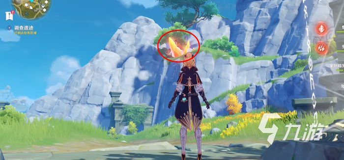 看到上面標(biāo)記區(qū)域的黃色大石頭了嗎,這個附近就有著我們需要尋找到的雕像,大家站在這個圓柱的附近轉(zhuǎn)動視角,就可以全部看到了,然后大家直接過去把這個龍形的雕像給激活就可以了。最遠(yuǎn)的那個雕像我們過去之后會有丘丘人攻擊我們,大家記得處理掉。之后大家開寶箱獎勵根據(jù)指示去村子里面看看。