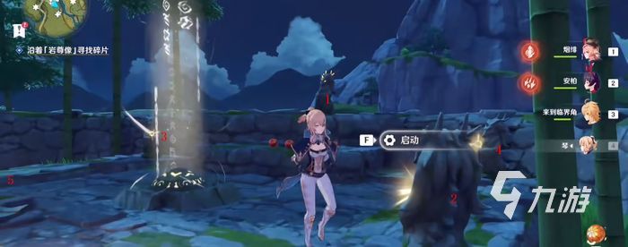 然后我們根據(jù)任務(wù)的指示繼續(xù)前進(jìn),這個時候會讓我們爬山來到村子的最高出,跟這個光柱交互之后,會告訴我們幾個位置,然后觸發(fā)這個位置的雕像就可以成功破解謎題了,很多的新手玩家們基本上都是倒在這里面。