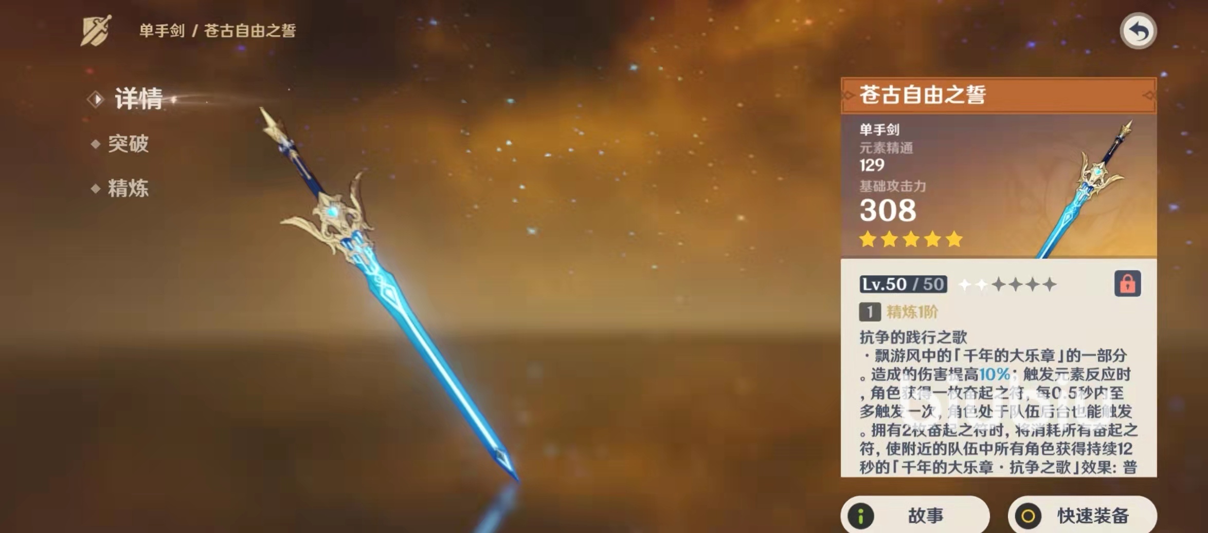 2.蒼古自由之誓,5星單手劍,楓原萬(wàn)葉專武,90級(jí)基礎(chǔ)攻擊力608,元素精通198。
