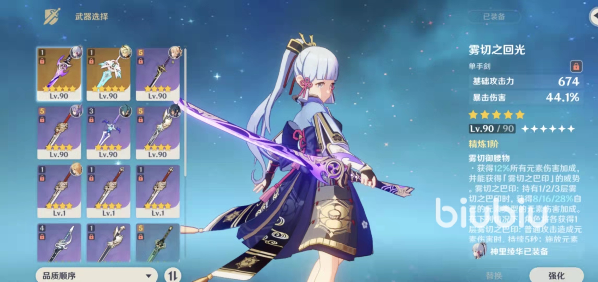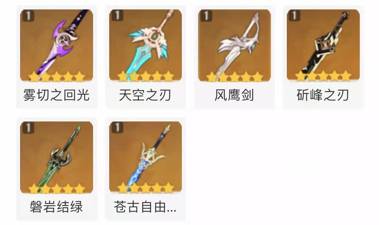 1.霧切之回光,5星單手劍,神里綾華專武,90級(jí)基礎(chǔ)攻擊力674,暴擊傷害44.1%。