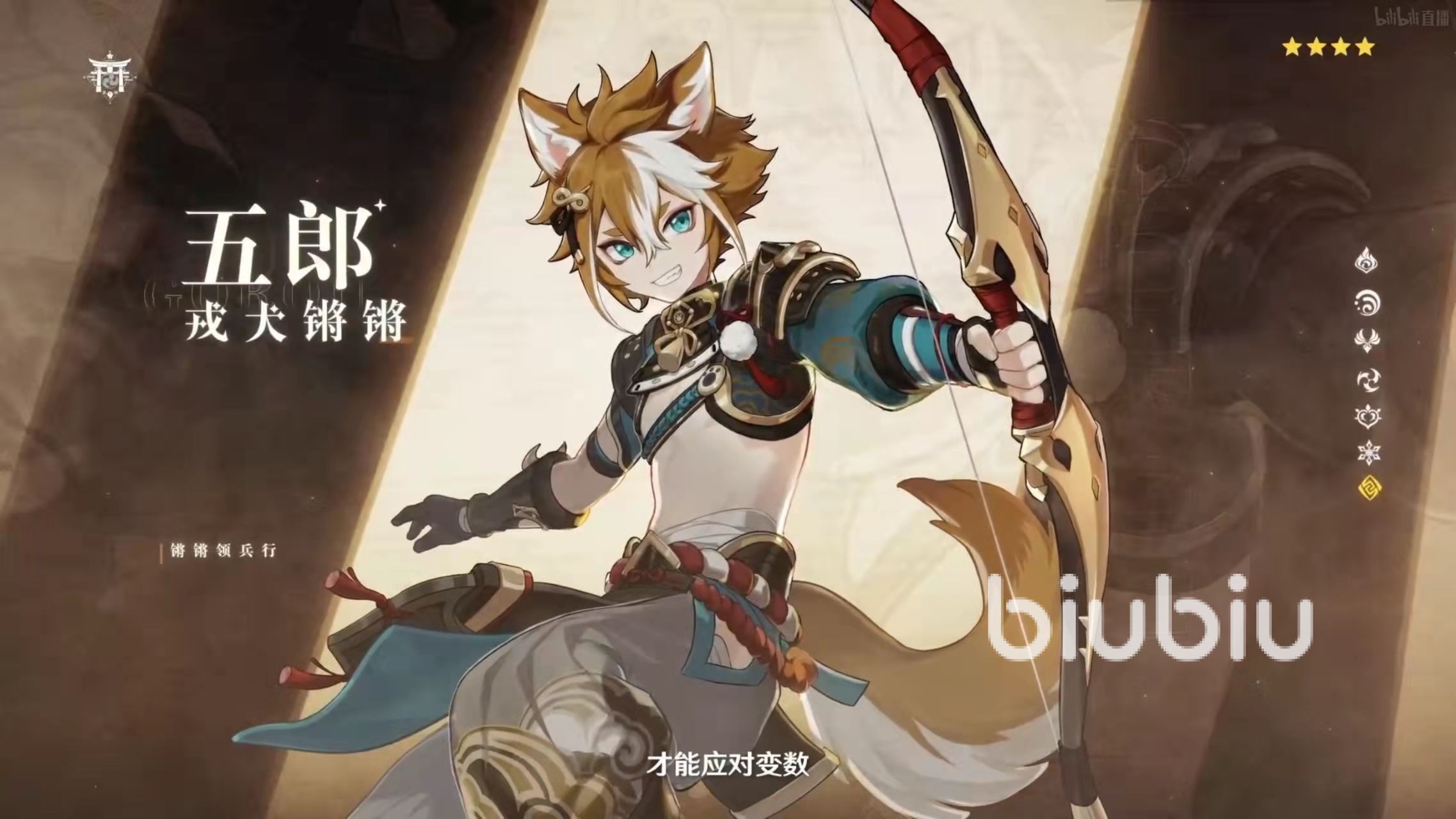 2.五郎,四星巖系弓箭角色,是和荒瀧一斗一塊進(jìn)入2.3版本下半部分卡池的角色,是一個(gè)可愛(ài)的正太小狗狗。角色主要定位是輔助,而且是巖系專(zhuān)屬輔助,就和九條裟羅綁定雷神一樣,五郎也是給荒瀧一斗提升上限的。