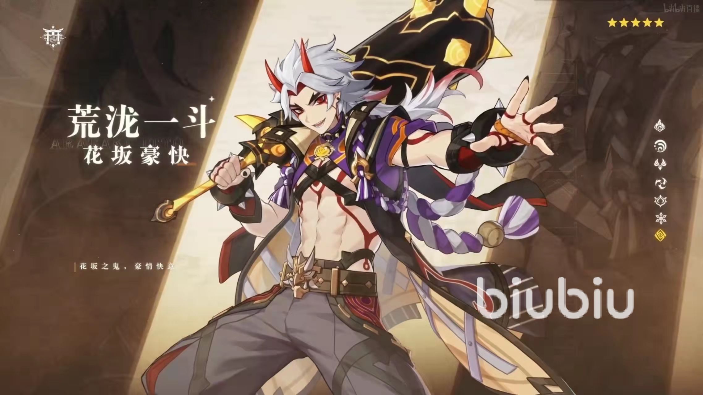 1.荒瀧一斗,五星巖系雙手劍角色,是鬼族的一員,自己組成荒瀧派,給人的印象是一個(gè)熱血少年又有點(diǎn)逗比的感覺(jué),特別是直播中的名場(chǎng)面“哈哈哈”就讓人不得不愛(ài)。這位是巖系首個(gè)主C角色,一定能撐起巖系榮光的。