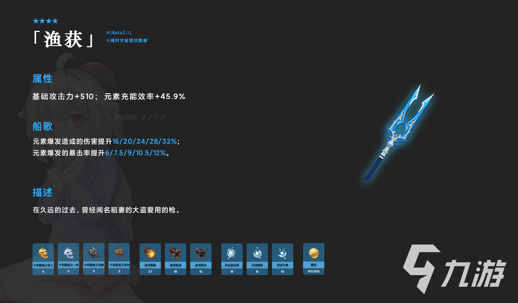 首先是這把長柄武器:漁獲,這個(gè)武器的詞條有基礎(chǔ)攻擊力增加510,元素充能效率增加45.9%;技能為船歌,造成的元素爆發(fā)傷害也是提升16%、20%、24%、28%、32%不等,元素爆發(fā)的暴擊率也有所提升,提升了6%、7.5%、9%、10.5%以及12%不等。獲取途徑為2.1版本活動(dòng)中的釣魚環(huán)節(jié)時(shí)獲得。