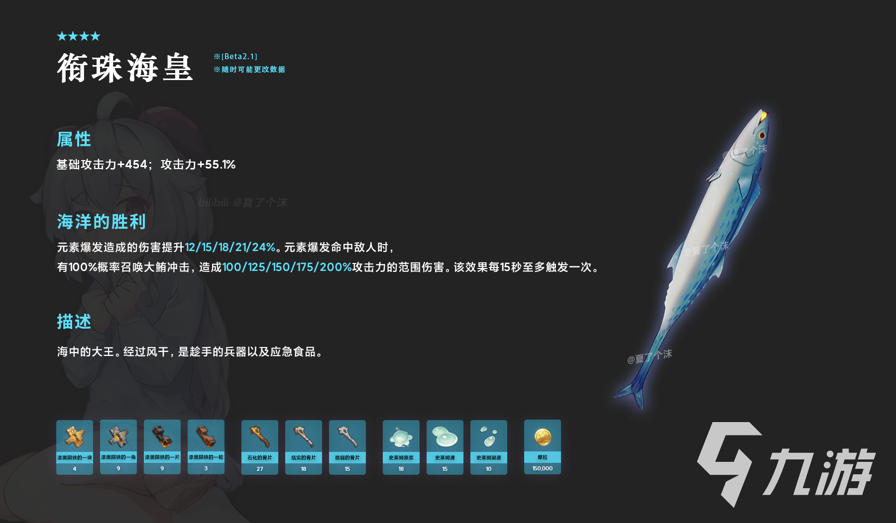 除了漁獲,還有這把銜珠?;剩愋褪请p手劍,也是我們?cè)?span>2.1更新直播時(shí)看到的,早柚手持的那只大咸魚,非常適合她,非??蓯?!這把武器的詞條為基礎(chǔ)攻擊力增加454,攻擊力提升55.1%。
