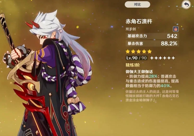 荒瀧一斗是一個依賴防御轉(zhuǎn)傷輸出的角色,這意味著攻擊將成為無效詞條。90級突破后自帶24.2%暴擊率與專武赤角石潰杵的暴擊傷害屬性相輔相成,很多人問小編為什么這把大劍具有88.2%的暴擊傷害卻沒有被冠以最強專武的稱號呢?大多數(shù)人依然認為五星武器中強度最離譜的依然是單手劍霧切之回光。那是因為雖然暴擊傷害很高,但是基礎(chǔ)攻擊很低,并且攻擊對于荒瀧一斗來說是無效詞條,只能通過暴擊傷害來彌補這一不足。而增加防御力與普攻和重擊傷害的特效,注定了這把刀只有一斗和諾艾爾這兩個人拿著才有用。
