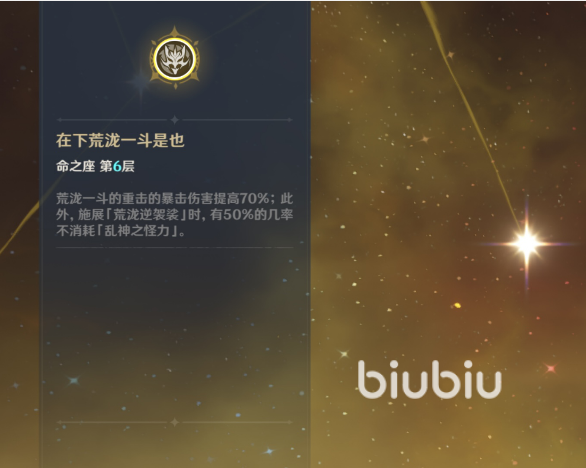 荒瀧一斗的最后一個命座可以讓自己的重擊暴擊傷害提高70%,六命拿專武不穿裝備就有超過158%的暴擊傷害,再帶個暴擊傷害頭就上200%暴擊傷害了,其余副詞條隨便歪一點,很容易出一個暴擊傷害達到300%的魔神級角色。配合華館四件套的防御加成與自身超高的防御數(shù)值,在提瓦特幾乎可以橫著走。