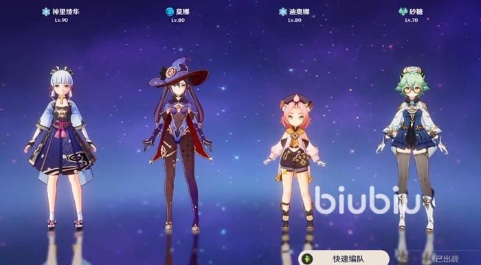 我們今天推薦搭配的是以冰元素角色神里綾華以及水元素角色莫娜為核心的陣容搭配,其他兩個(gè)角色選用的是冰元素的迪奧娜以及風(fēng)元素的砂糖。神里綾華是主C,提供了隊(duì)伍中的核心輸出,也是我們主要的站場(chǎng)角色。莫娜作為水元素角色則是提供了充能永凍的掛水以及大招的增傷效果。