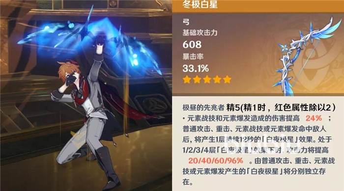 首先是將會在2.2版本登場的新武器冬極白星,這款武器非常適合公子,它的副詞條可以為角色帶來超過的暴擊率,武器效果不僅可以增加元素戰(zhàn)技和元素爆發(fā)傷害還可以增加不少的攻擊力,公子搭配這把武器真的是完美,當然除了公子之外甘雨也是可以裝備這把武器的,效果非常不錯。