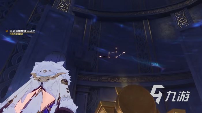 這個解密的機制其實并不復雜,不知道的玩家們多半是沒看劇情聊天,首先我們抬頭看天上,這里面可以看到頂部有著類型星座的標記,我們只需要按照圖示進行鏈接就可以開啟大門了。