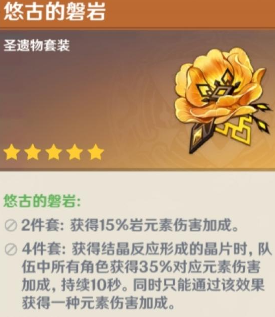 玩家可以考慮直接攜帶悠古四件套,四件套除了基礎(chǔ)的巖元素加傷外,還能給隊(duì)伍的其他角色提供傷害加成,元素傷害加成在短時(shí)間內(nèi)得到飆升,增強(qiáng)阿貝多的輔助能力。但是想要觸發(fā)該效果,還得阿貝多手動拾取晶片才行。