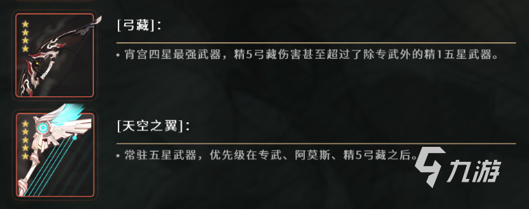 天空系列的武器,常駐池可抽取。在大家沒有專武、阿莫斯、精煉五級(jí)的弓藏武器時(shí),如果有天空之翼,也不失為一項(xiàng)好選擇。畢竟五星武器難得。