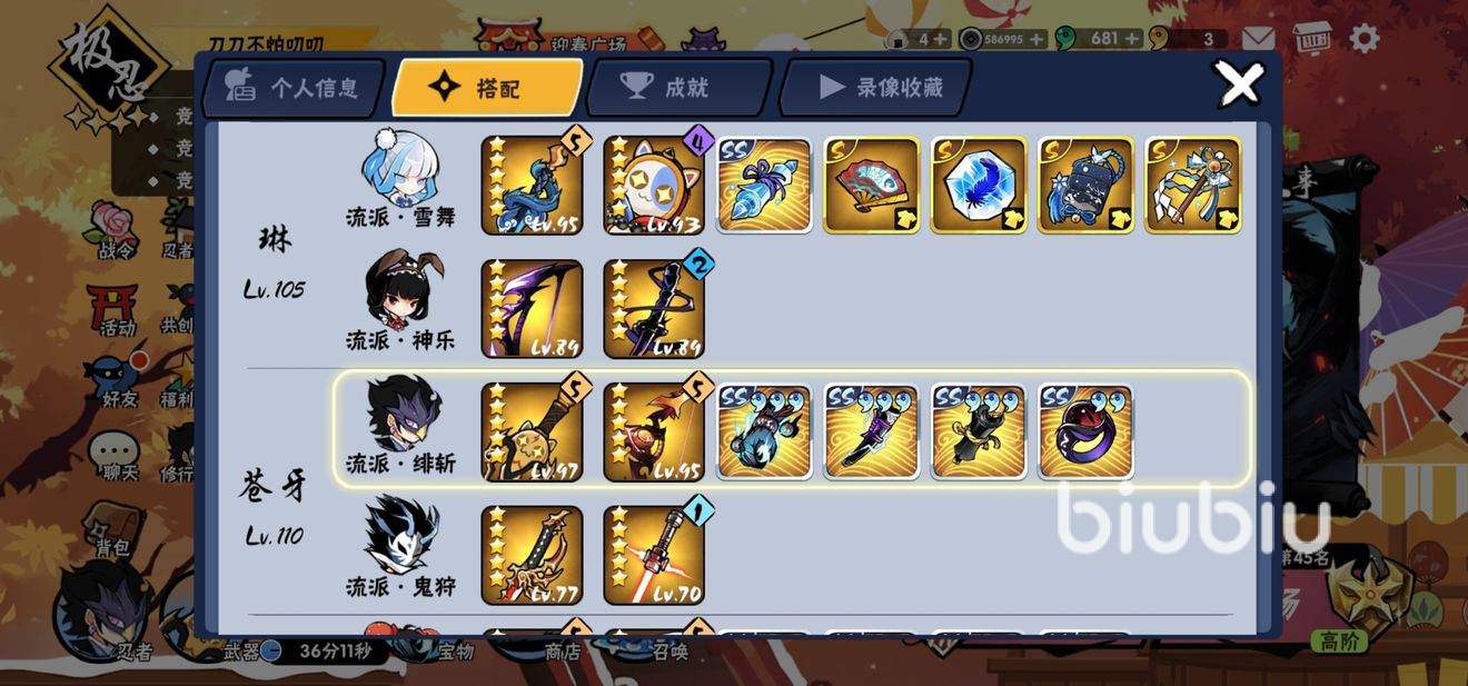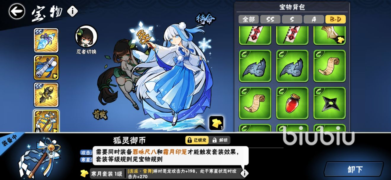 1、忍者必須死3這款游戲中有眾多SS寶物,不過分為兩種方式,分別是場景分類和人物分類。小編推薦為琳寶使用人物專屬套裝、再配合其他寶物。