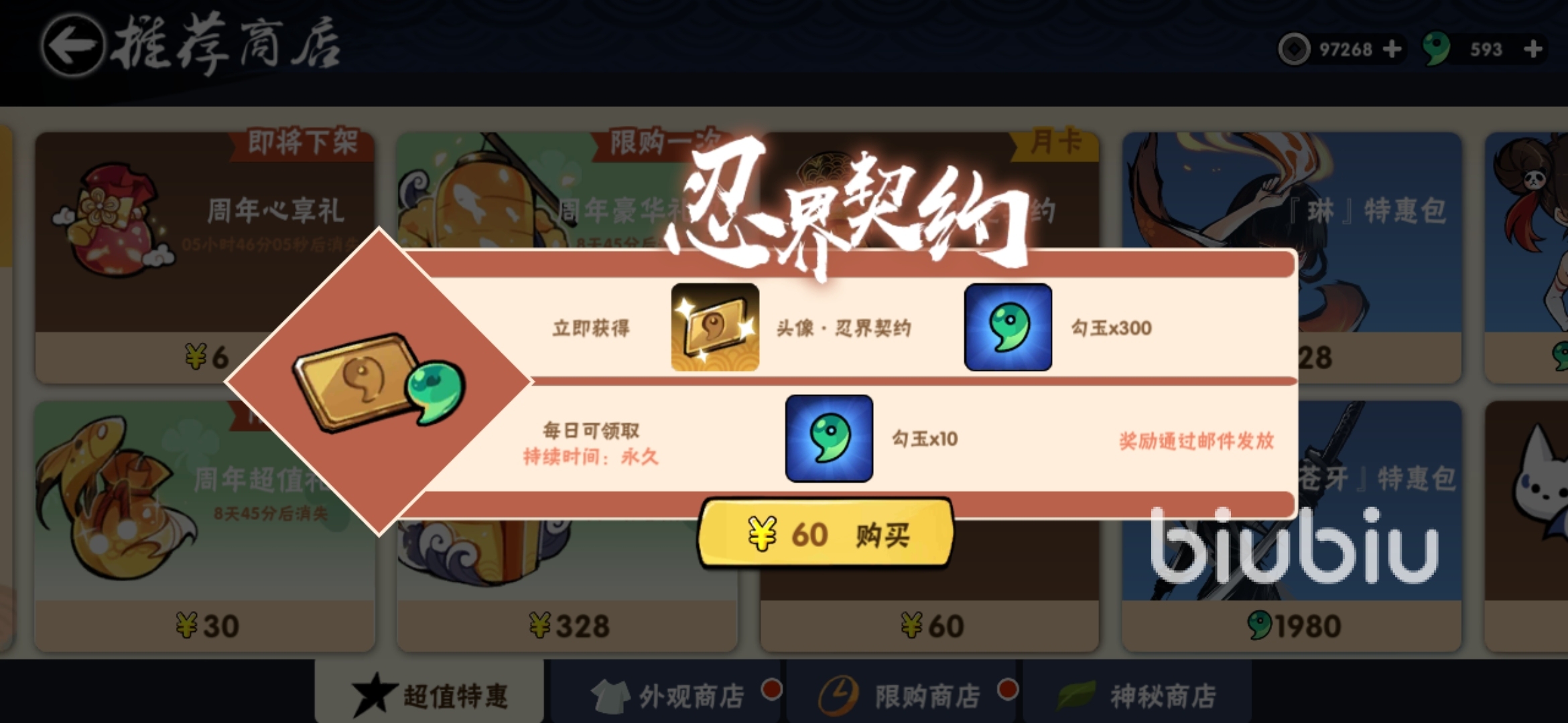 目前,忍者必須死3手游中的神龍契約為月卡,期限為30天,價格為18元,而忍界契約的期限為終身卡,價格為60元。