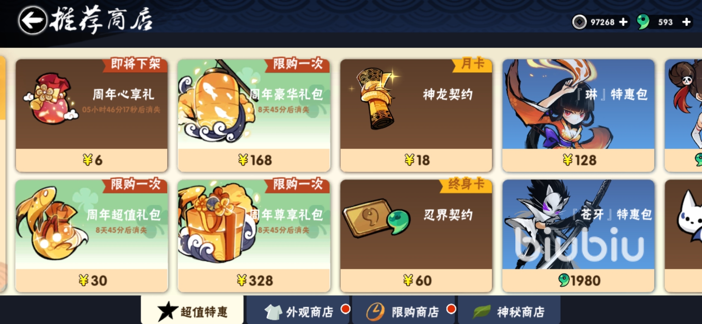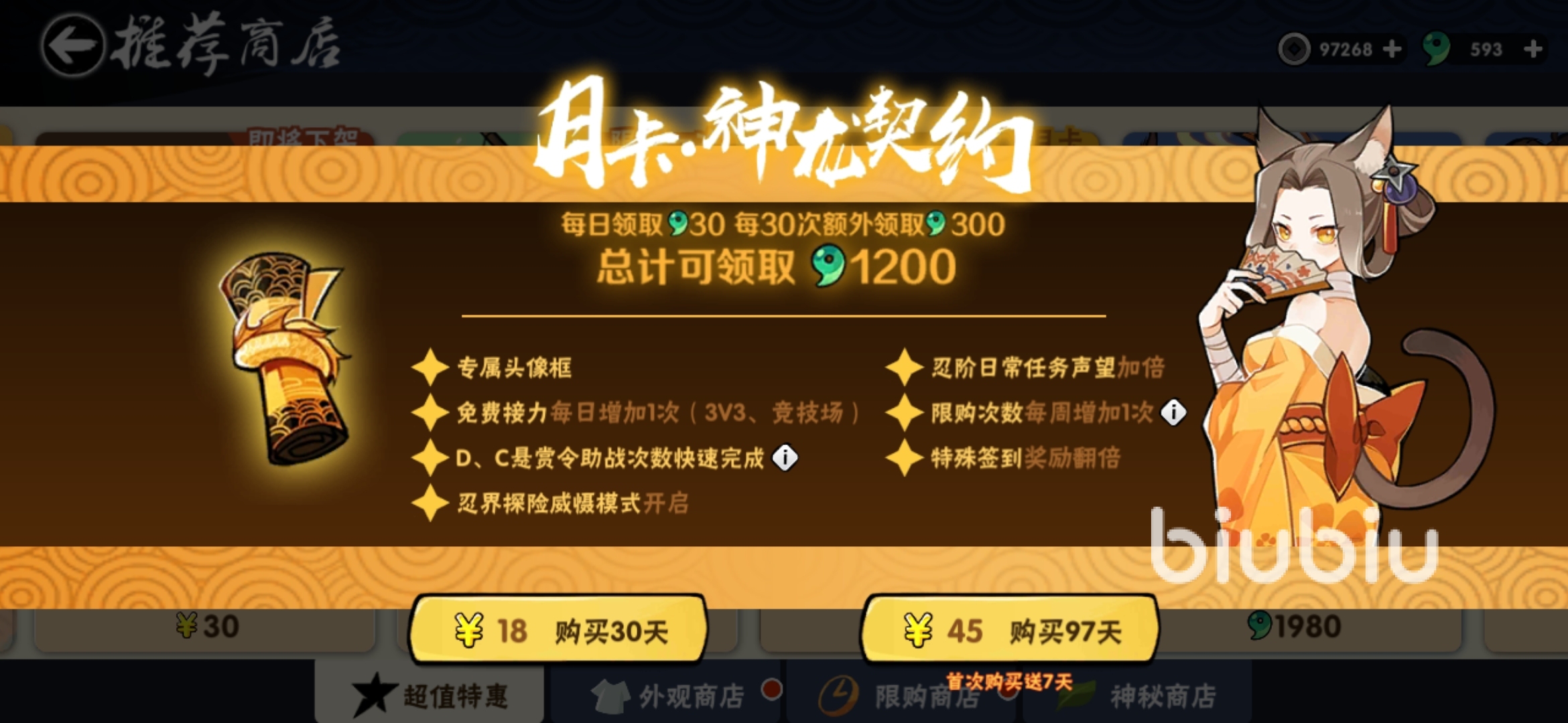 護符現(xiàn)在改名為契約,有神龍契約、忍界契約兩種,也就是不少玩家所說的月卡。
