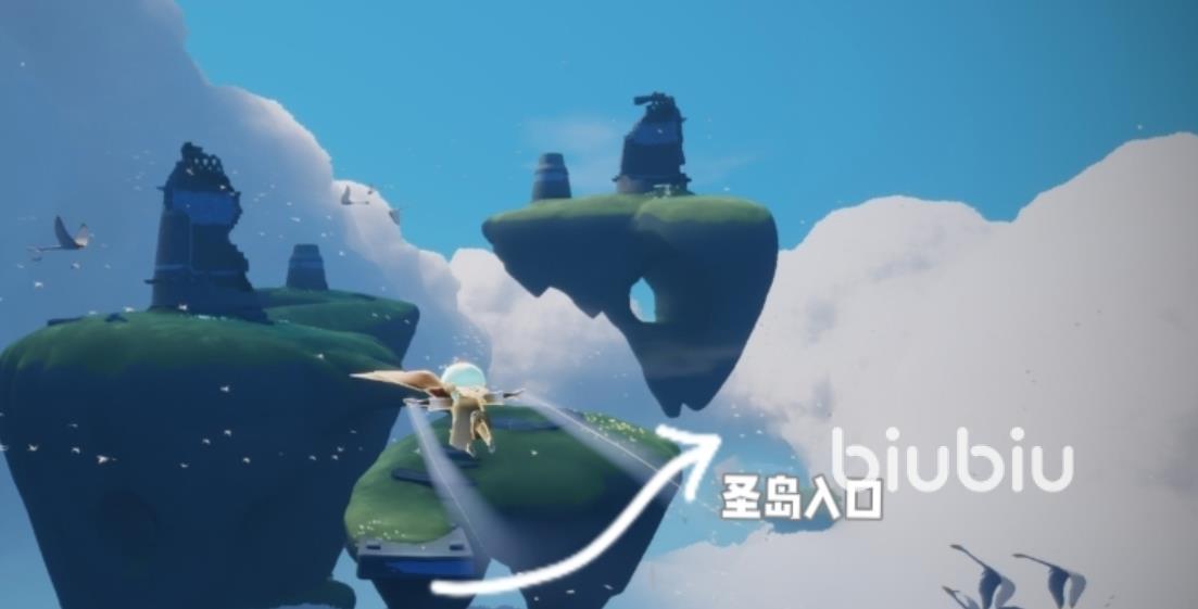 來到一圖以后,在其右側(cè)的云層同樣能看到一個洞口,飛進去,穿過之后,就來到浮石圖了,而下圖指的那個方向就是圣島圖的入口,飛過去;