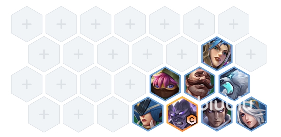 站位上我們也一定要有所注意,這里將所有的英雄全部放在底角位置處,然后將豬妹,凱南,冰女放在外邊的位置,這樣忍者刺客一過來就會吃到控制效果。運營上,我們前期是可以用極地來慢慢過渡的,攢錢提升等級就好了,陣容的過渡還是非常平滑的。
