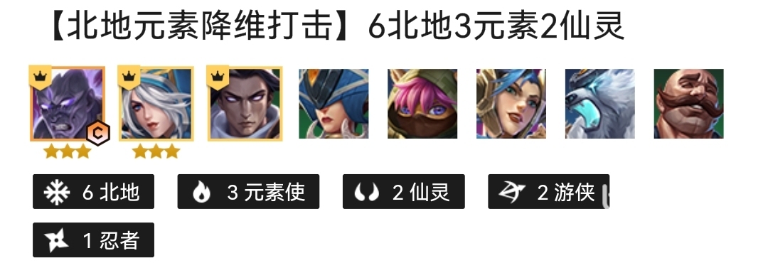 陣容由火男,艾希,韋魯斯,注意這里韋魯斯是需要極地轉(zhuǎn)職的,冰女,凱南,豬妹狗熊,布隆組成的。這樣搭配的陣容的羈絆效果為六北地,三元素使,兩仙靈,兩游俠,一忍者,羈絆效果是非常給力的,控制元素拉滿,可以很大程度上限制忍者刺客的發(fā)揮。