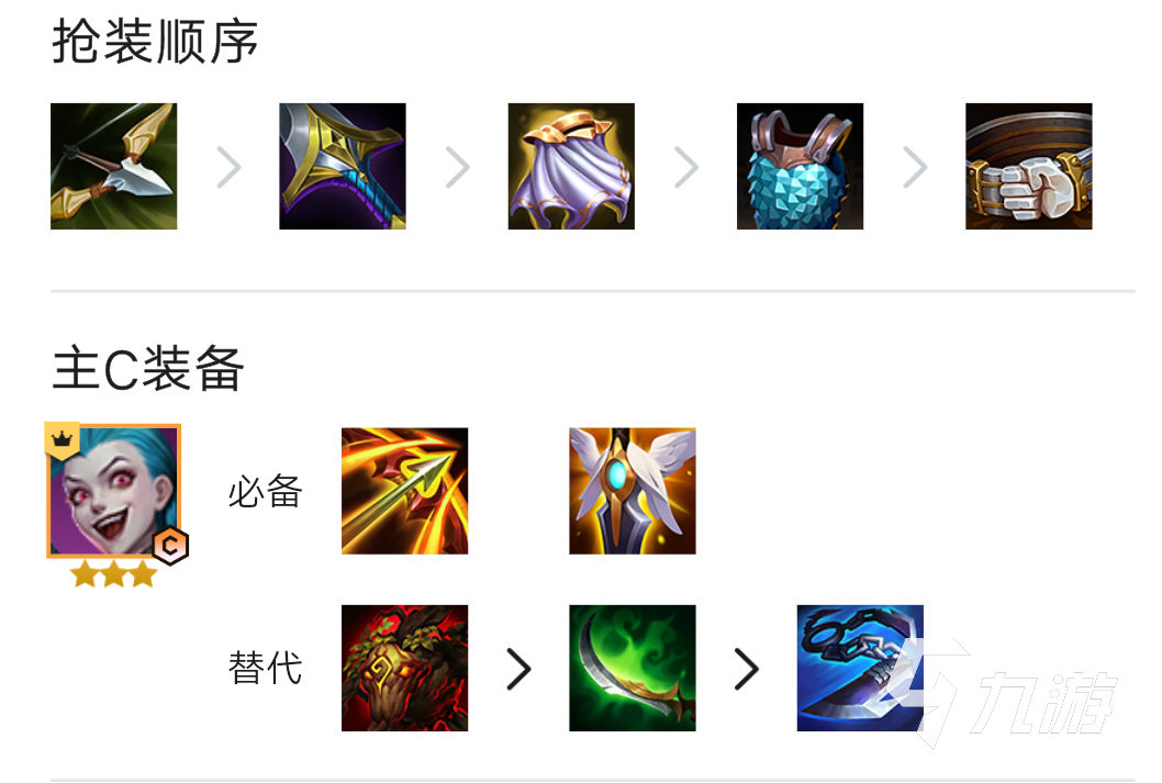 上面說到,主要C位是暴走蘿莉,所以我們要優(yōu)先搶到她的裝備,建議開局搶反曲之弓,這樣可以直接合成她的裝備,颶風(fēng)是最適合她的裝備,可以幫助她快速的啟動(dòng)。也能夠搭配各種特效裝,復(fù)活甲則是為了增加容錯(cuò),畢竟這是一套單核體系,蘿莉被秒了后陣容會(huì)缺乏輸出。最后一件可以是巨殺,打斗槍或者狂野斗士3星龍女都很好打,不然有可能刮痧;其次也能用4-2給的特效裝代替,比如說紅Buff和降星刀、沉默刀都很不錯(cuò)。