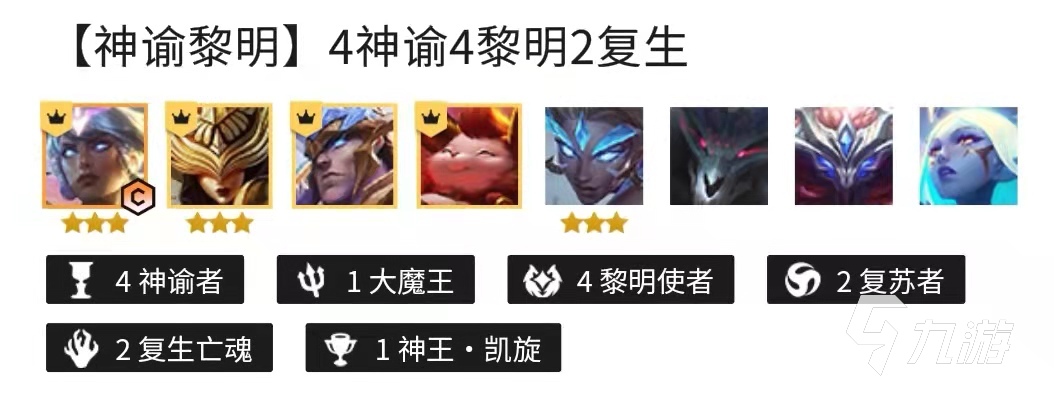 陣容羈絆:4黎明使者+4神諭者+大魔王+神王凱旋+2復(fù)蘇者+2復(fù)生亡魂