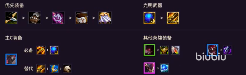 其次羊刀、輕語(yǔ)、殺人也都可以選擇。肉裝給到前排加里奧即可,多余的物理輸出裝可以給到阿克尚。