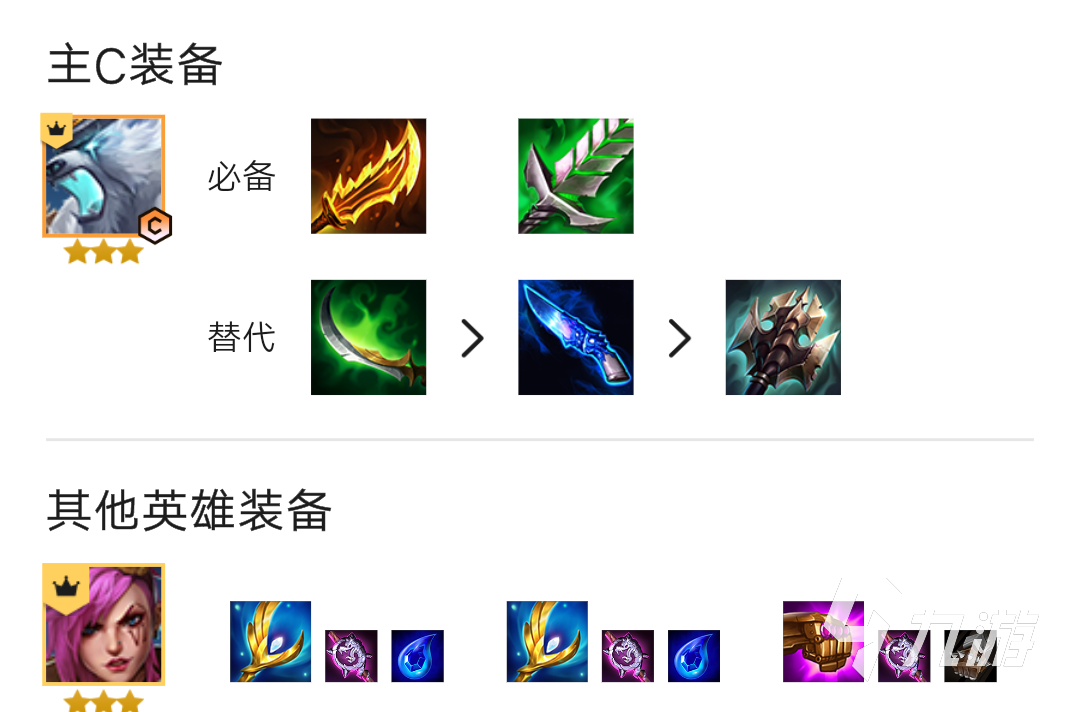 主C雷霆之怒:汲取劍,無盡之刃,鬼索的狂暴之刃(或額外爆的特效裝)副C皮城執(zhí)法官:大天使之杖,大天使之杖,珠光護手等法強裝副C齊天大圣:基克的先驅,救贖,女妖之爪等功能裝。