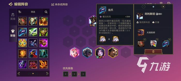 而前排的話坦克裝備還是常規(guī)的龍牙反甲加上救贖,這里需要注意這個坦度裝備給牛頭而不是加里奧。加里奧的英雄登場會飛到天上,這個短暫的時間會讓對面的后排輸出去打我們牛頭,此時牛頭沒有裝備的話非常容易陣亡。而且總的來說牛頭的控制效果是強于加里奧的,而且技能的釋放頻率更高。